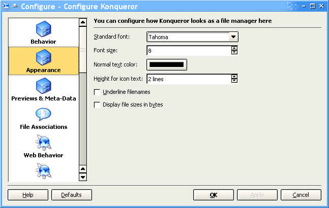We used the same Tahoma 8pt for rendering the list of files in Konqueror's window, because Tahoma was simply designed with this purpose in mind, with 8pt being its most important size, with no need of anti-aliasing to be clear and beautiful.