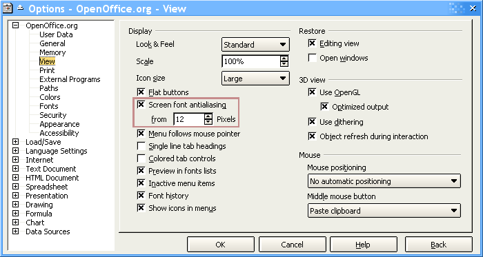 So we basically selected Tool, Options menu, and in the View section we enable OOo to do anti-aliasing at font sizes beginning with 12 pixels (approximately 9pt), and the result is what you can see above: clean and comfortable widgets with Tahoma 8pt.