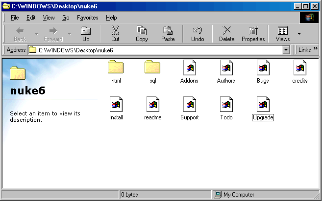 Well... there is little to say here, it suffices to go to a site that holds the files and download them. There is only a small remark to make: if you use Windows and download a version comprised of a file with the ending tar.gz, do not worry, your Winzip supports it without problems. Once downloaded, extract it and "throw" all its contents in a folder you created for this purpose and you call "Nuke5" or whatever ( sites from which you can download PHP-Nuke are: phpnuke.org, www.spaghettibrain.com etc.).