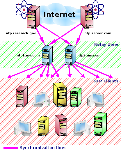 If you have several machines to synchronize, do not make them all access the remote NTP servers you chose. Only 2 of your server farm's machines must access remote NTP servers, and the other machines will sync with these 2. We will call them the Relay Servers.